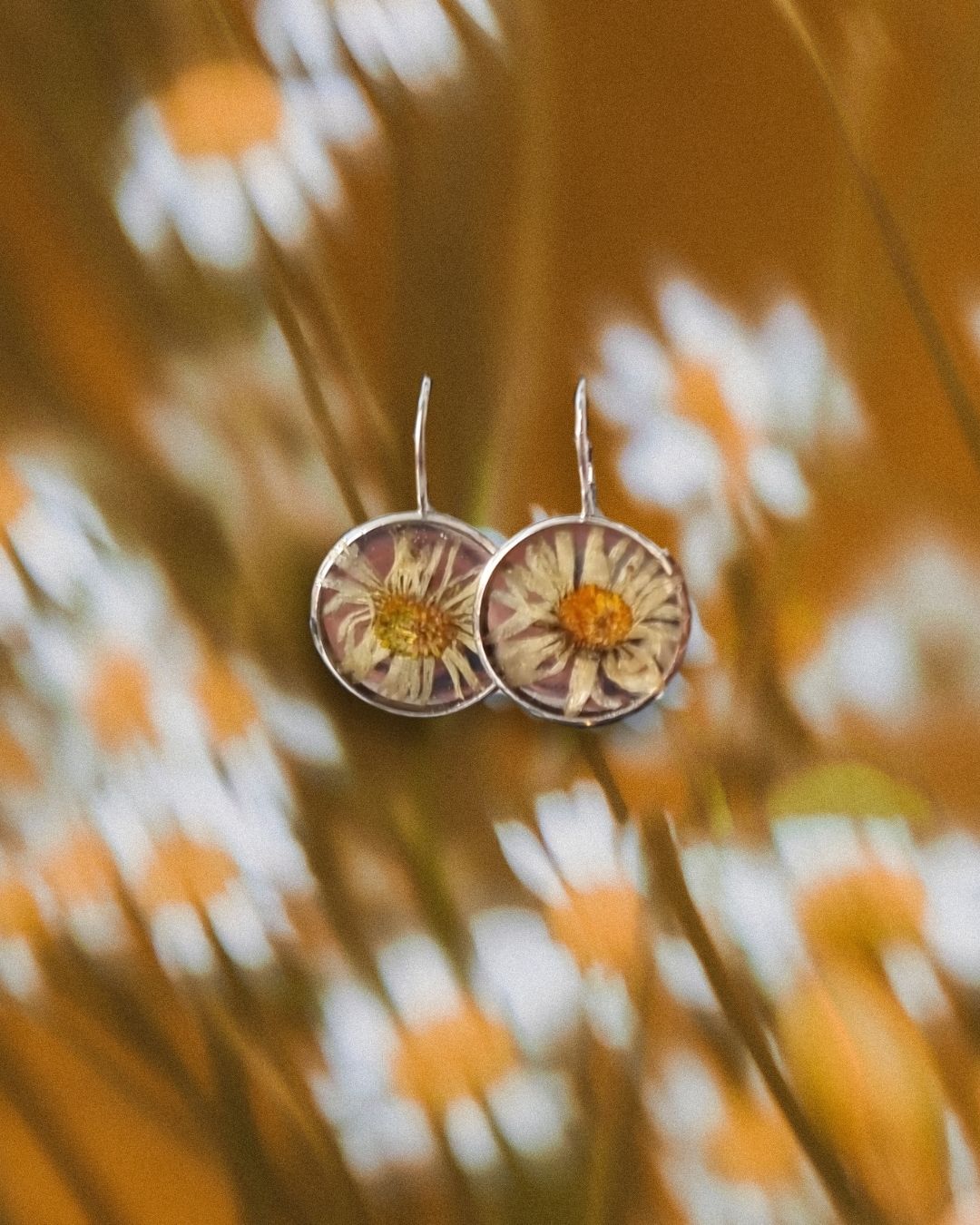 Pendientes hechos con flor de Margarita silvestre prensada y conservada en resina. ¡Lleva una flor real en tus pendientes! Hechos a mano con mucho amor <3.