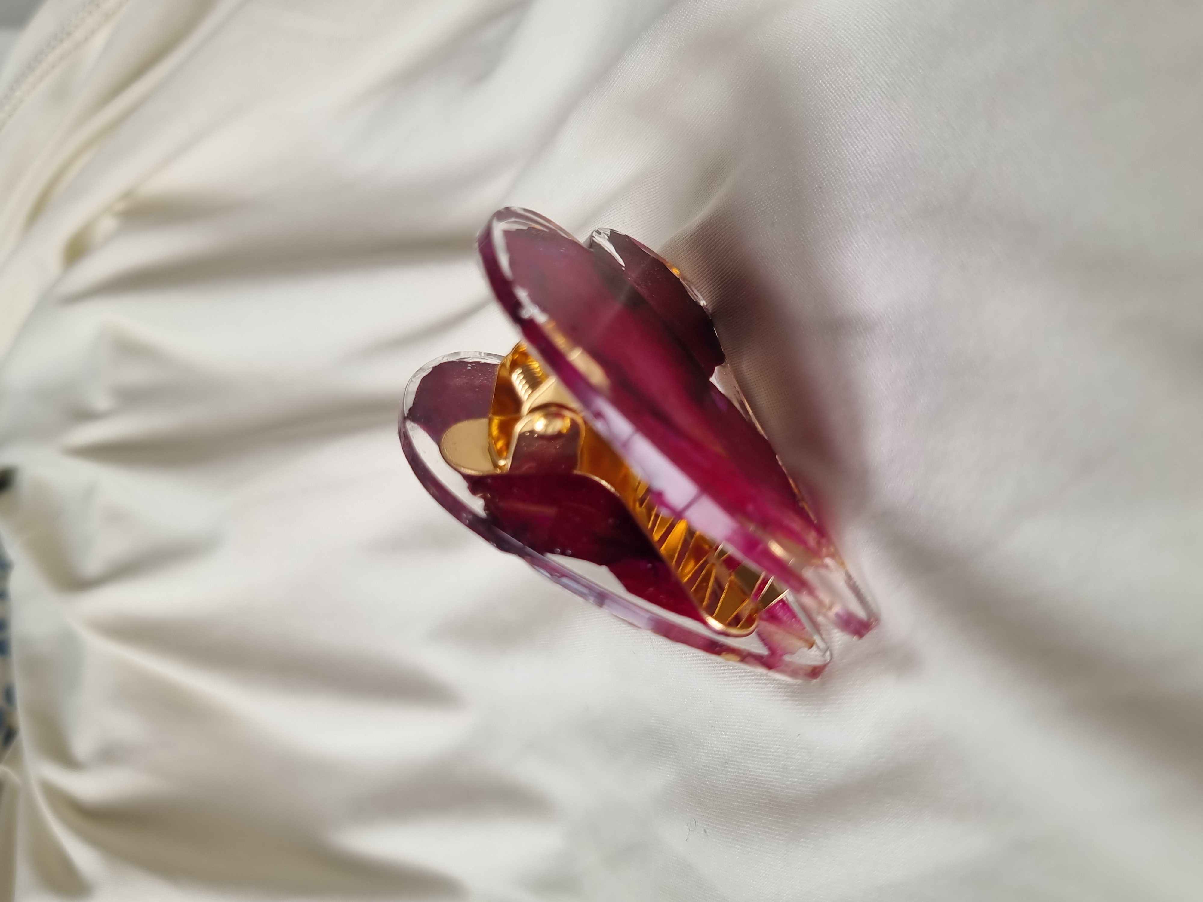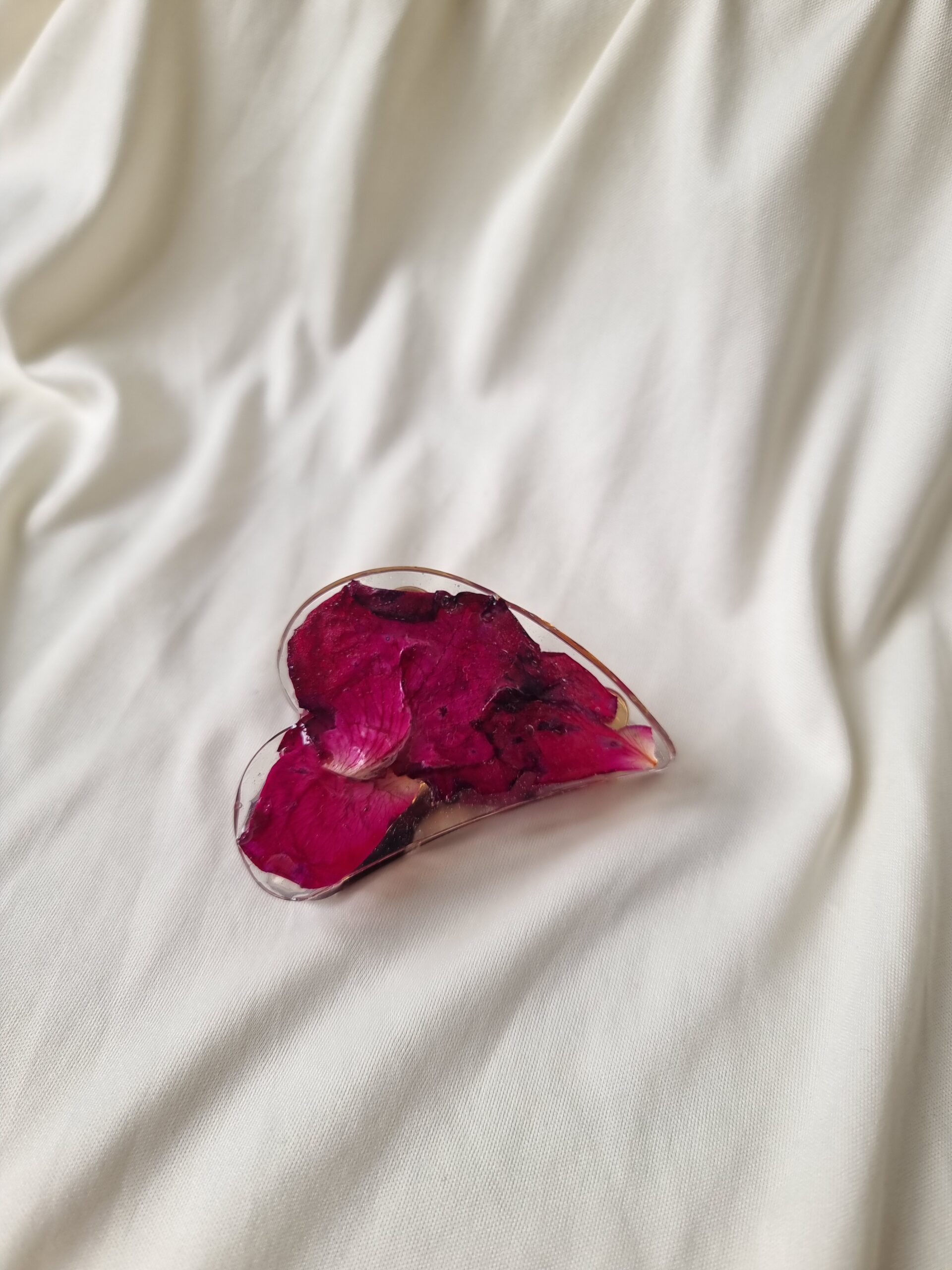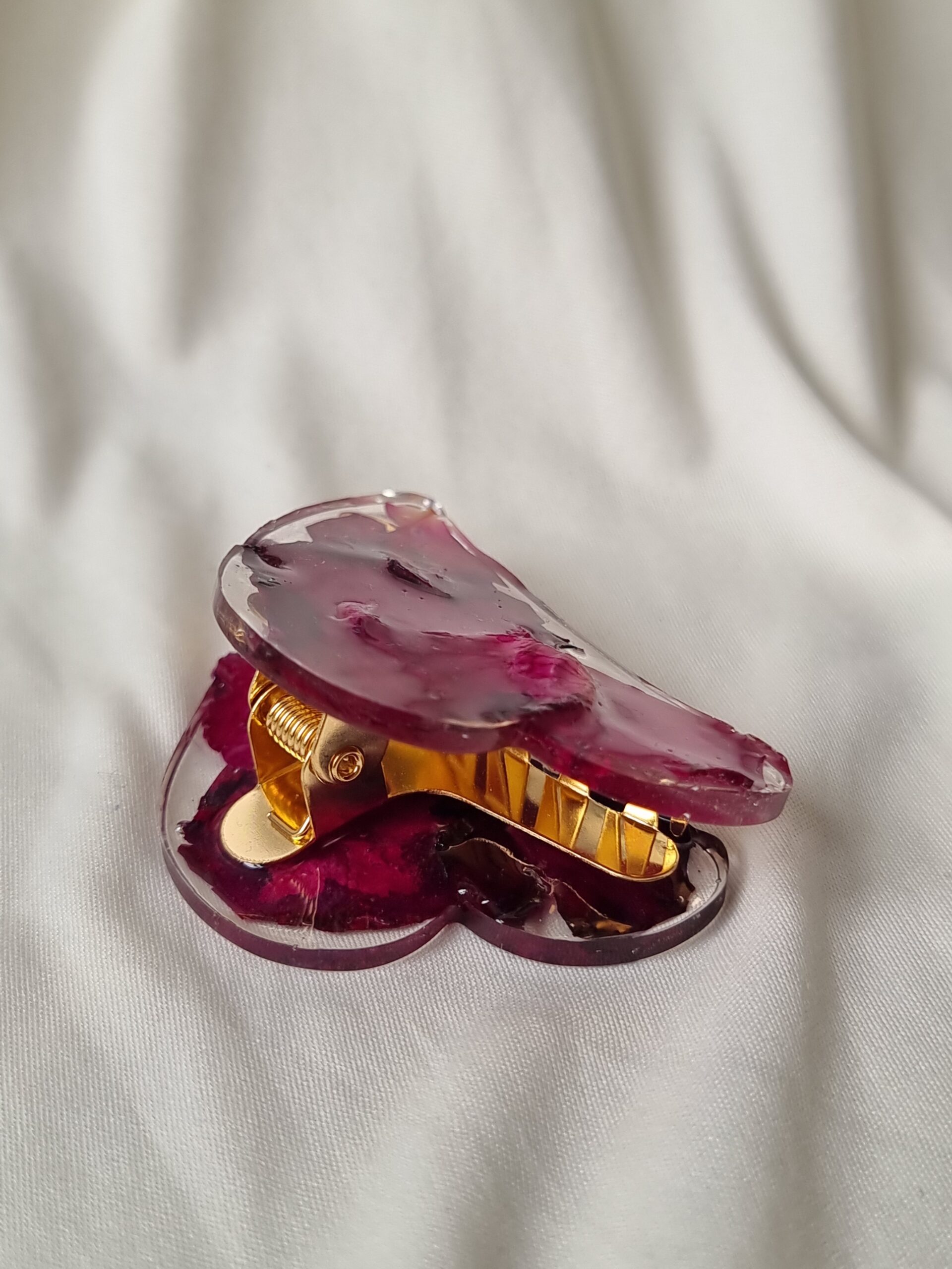 Pinza para el cabello hecha con pétalos naturales de Rosa prensados y preservados en resina, súper colorida, para darle un toque original y delicado a cualquier look.
