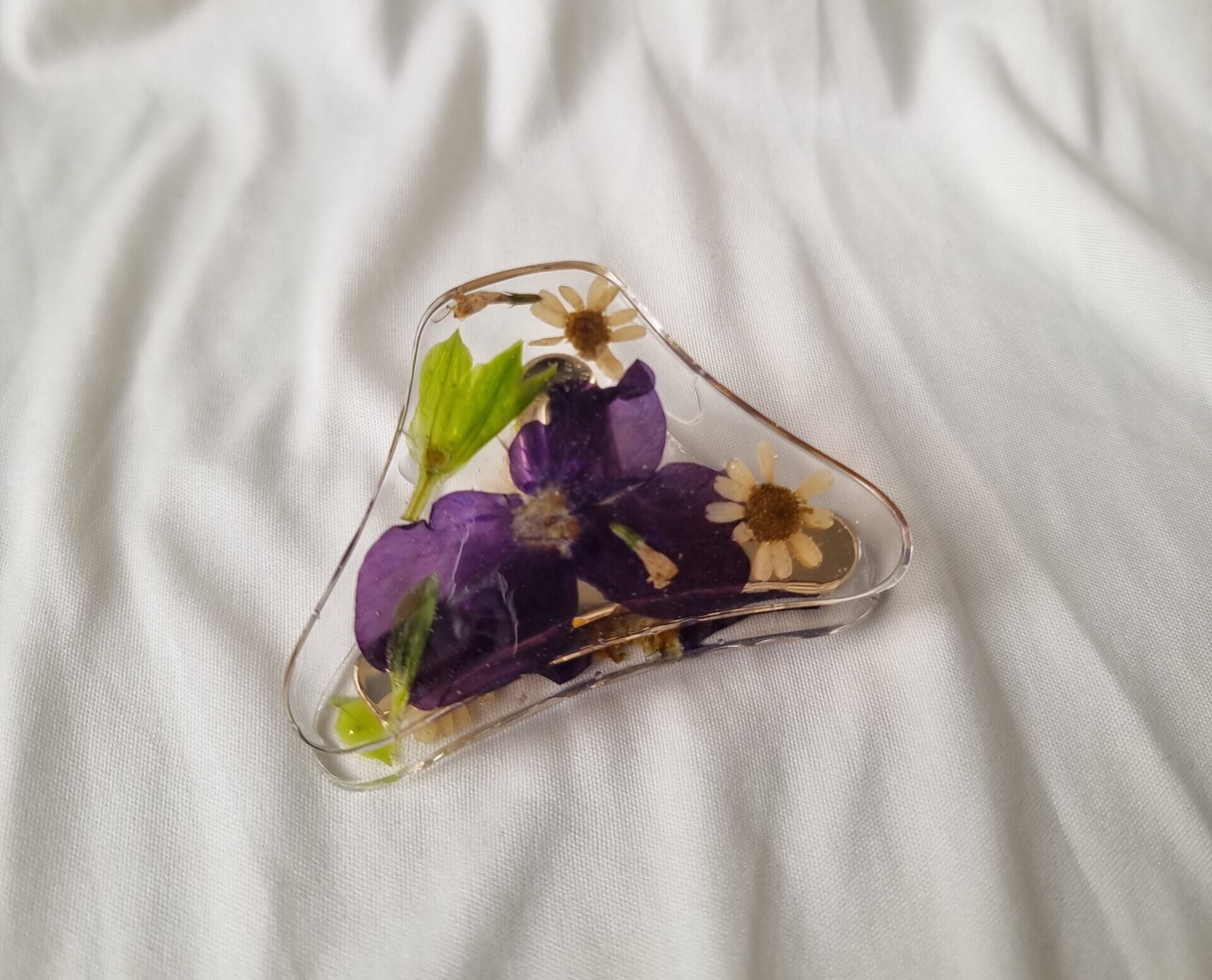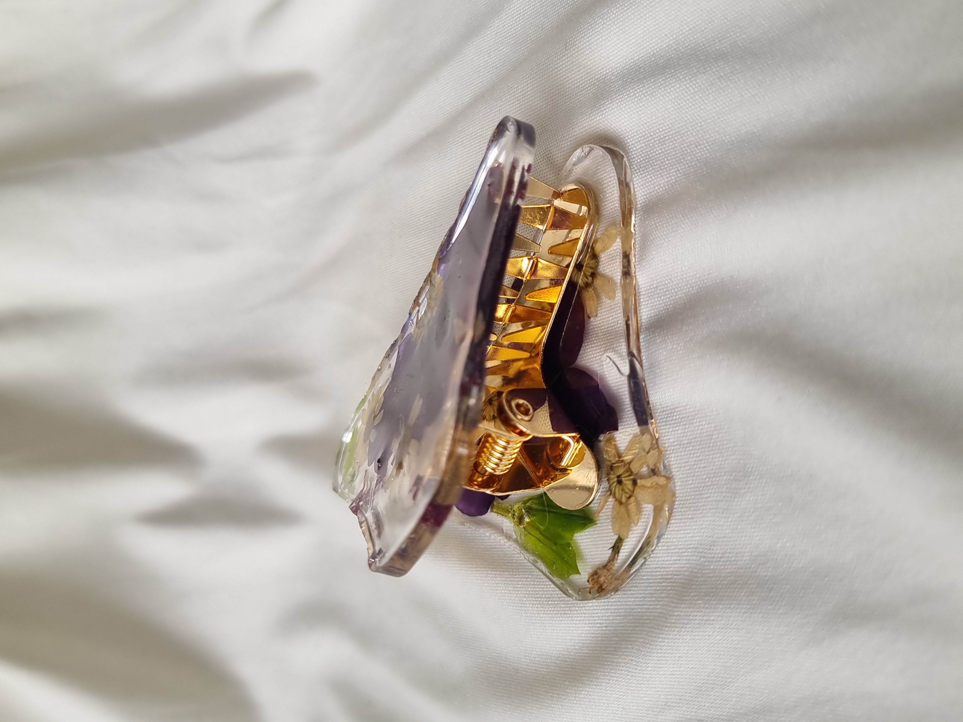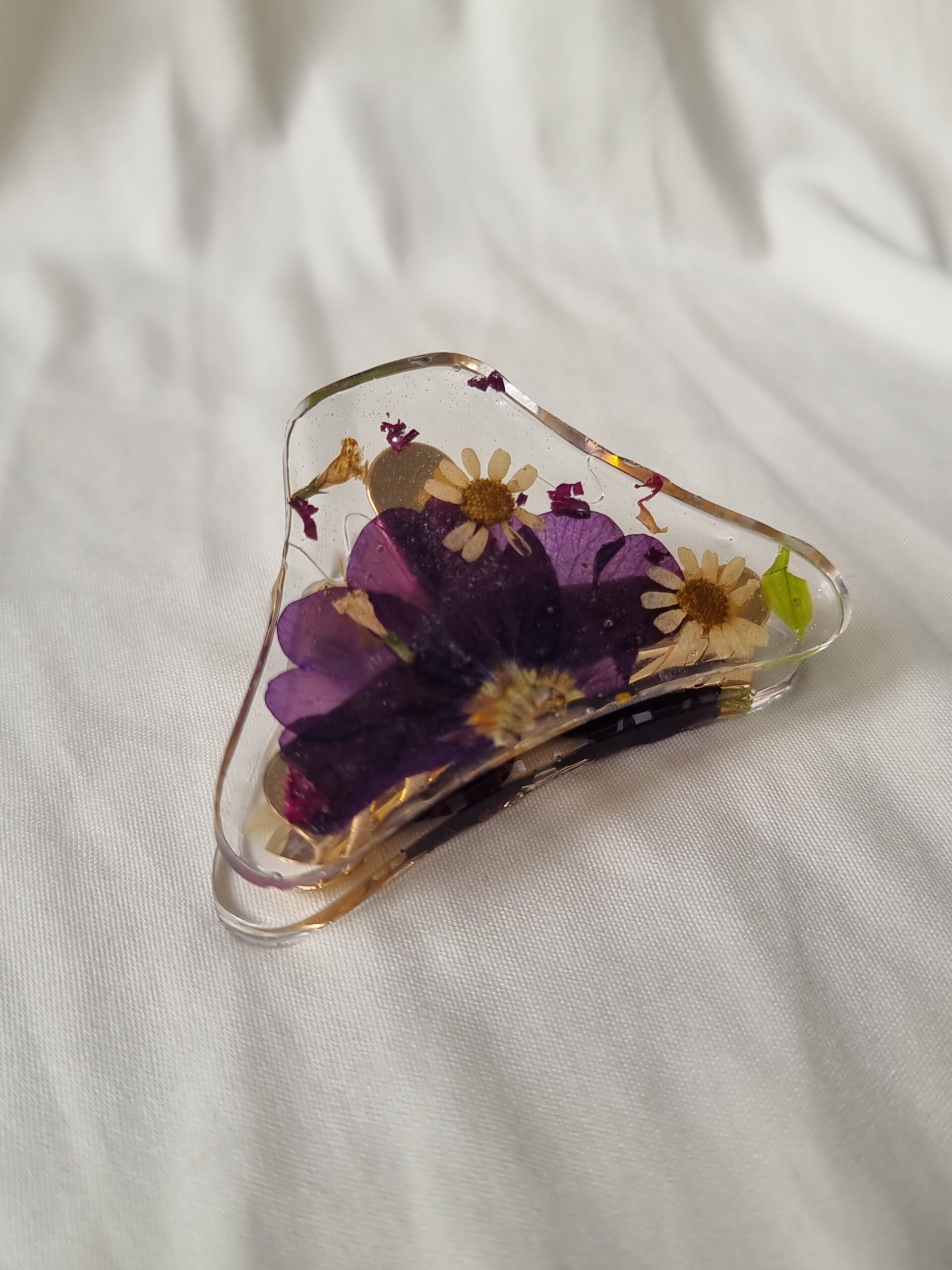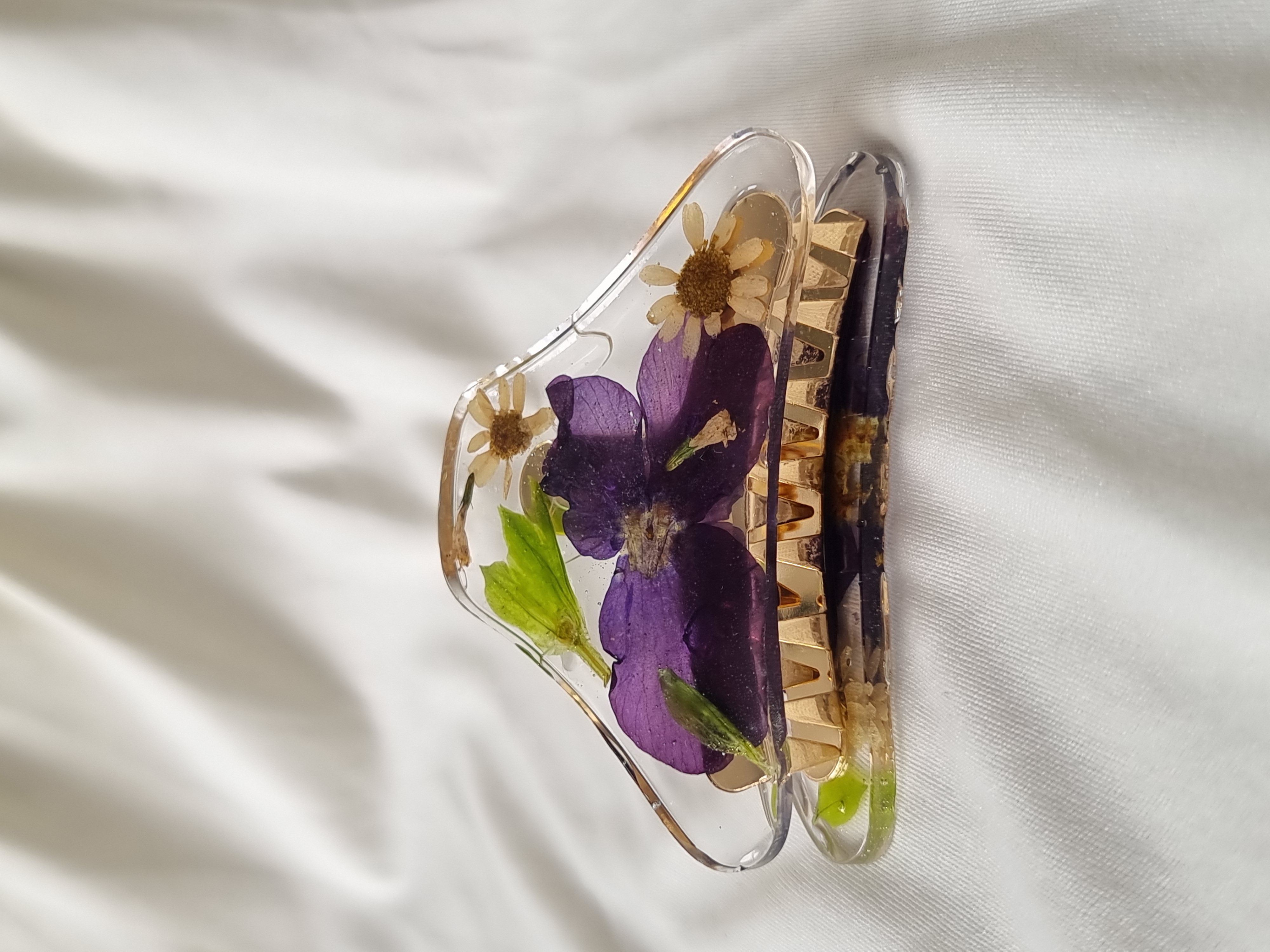Pinza para el cabello hecha con flores naturales prensadas y preservadas en resina, súper colorida, para darle un toque original y delicado a cualquier look.